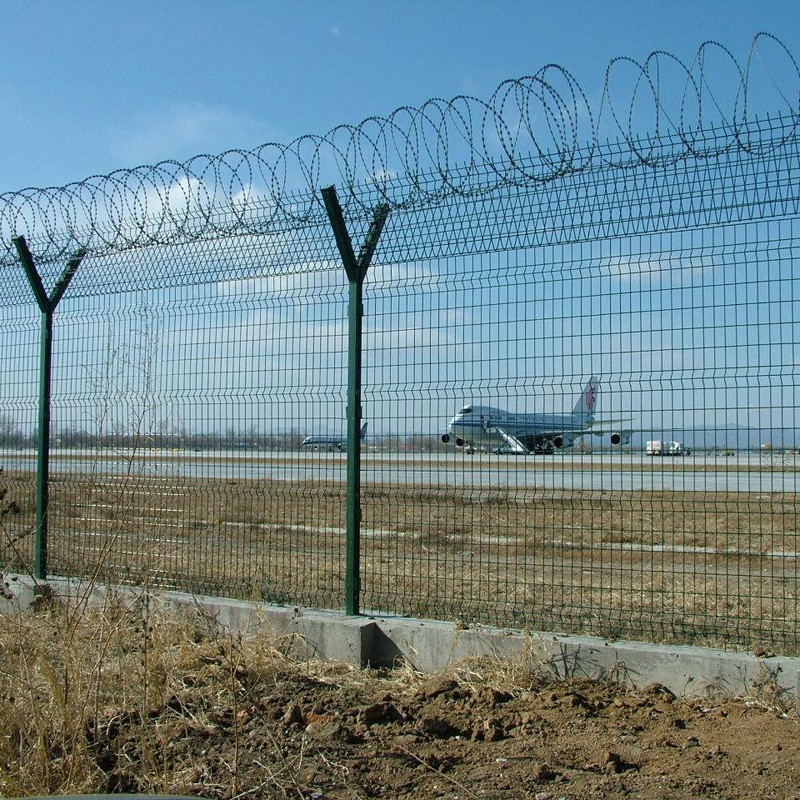 機(jī)場(chǎng)飛行區(qū)圍界網(wǎng)的組成多由Y型立柱+鋼筋焊接網(wǎng)片+蛇腹式刀刺網(wǎng)組合而成,大多數(shù)時(shí)候叫做機(jī)場(chǎng)鋼筋網(wǎng)圍界、機(jī)場(chǎng)鐵絲網(wǎng)圍界或者機(jī)場(chǎng)防護(hù)網(wǎng),但是這類防護(hù)網(wǎng)不只是應(yīng)用在機(jī)場(chǎng)。由于這種鋼筋網(wǎng)結(jié)構(gòu)有很好的隔離和防攀爬功能,可以應(yīng)用在很多地方,例如廠區(qū)、園林、軍事、邊防等等。安平縣艾瑞金屬絲網(wǎng)有限公司生產(chǎn)的機(jī)場(chǎng)圍界網(wǎng),專注于高質(zhì)量、安全性,隨著市場(chǎng)的不斷更新迭代,我們出品了多款機(jī)場(chǎng)鋼筋網(wǎng)圍界,滿足不同地域、不同級(jí)別、不同環(huán)境的需求。