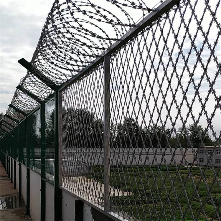 監(jiān)獄高墻隔離網(wǎng)也叫巡邏道隔離網(wǎng),是監(jiān)獄非常重要的安全防護設(shè)施,由鋼筋焊接成網(wǎng)加蛇腹型刀片刺網(wǎng)組合而成,監(jiān)獄高墻隔離網(wǎng)具有結(jié)構(gòu)新穎、堅固緊密、網(wǎng)面平整、網(wǎng)孔均勻、刀鋒銳利、防攀爬、坑腐蝕等特點。監(jiān)獄高墻隔離網(wǎng)是建在監(jiān)獄的內(nèi)外墻上,網(wǎng)墻內(nèi)側(cè)或者頂部加裝蛇腹型刀刺網(wǎng),形成一道高不可攀、難以逾越的隔離網(wǎng)屏障,配合高壓打擊電網(wǎng)和監(jiān)控報警設(shè)備等保障監(jiān)獄安全萬無一失。