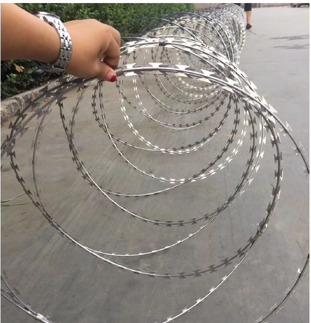 刀片刺網(wǎng),是一種近年發(fā)展起來的防護(hù)、隔離能力較強的防護(hù)產(chǎn)品,采用優(yōu)質(zhì)鋼片沖壓尖刺包裹高強度鋼絲壓制而成,雙線用卡扣銜接固定,呈現(xiàn)螺旋型。世界各國已將刀片刺網(wǎng)廣泛用于軍事重地、監(jiān)獄、政府機關(guān)、銀行、生活小區(qū)圍墻、私人住宅、別墅圍墻、鐵路柵欄加高以及邊境線等的安全防護(hù)。