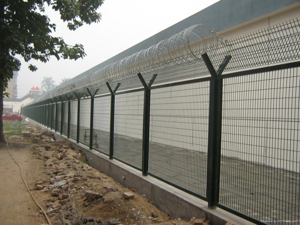 監(jiān)獄外圍鋼網(wǎng)墻內(nèi)墻鋼網(wǎng)墻圍墻鋼網(wǎng)墻-般頂端都設(shè)有V型支架與立柱焊接。材料通常選擇和立柱同等材料或者稍小規(guī)格材料搭