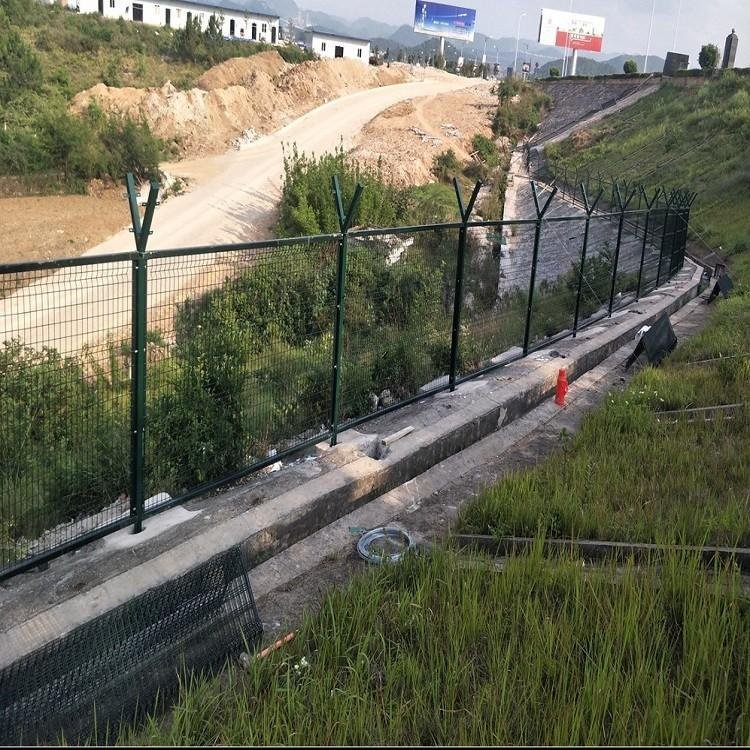 機(jī)場(chǎng)圍界隔離網(wǎng)又稱作“Y型安全防御護(hù)網(wǎng)”,是由V型支架立柱,加強(qiáng)型焊接片網(wǎng),安全防盜.連接件和熱鍍鋅刀片刺籠組成強(qiáng)度和安全防御性級(jí)別很高。近年來(lái),被廣泛應(yīng)用在機(jī)場(chǎng),軍事基地等高安全場(chǎng)所。在隔離網(wǎng)頂部加裝刀片刺絲、刀片刺繩后又很好的增強(qiáng)了防護(hù)性能。