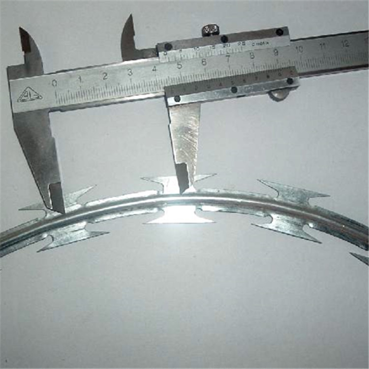 刀片刺絲又名刮刀型刺絲,是一種近年發(fā)展起來的防護、隔離能力較強的新型防護網(wǎng)產(chǎn)品。它采用鋼板沖壓成型包附于鋼絲(筋絲)之上,由銳利尖角鍍鋅鋼板或不銹鋼薄板做刀片,高張力鋼絲做芯線組合而成的。鋒利的刀型刺由雙線扣裝后成蛇腹狀,既美觀又讓人不寒而粟。起到了很好的阻嚇作用。該產(chǎn)品具有美觀、防阻效果好、施工便利等優(yōu)點。